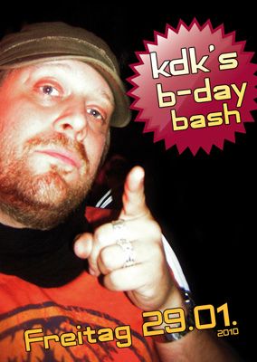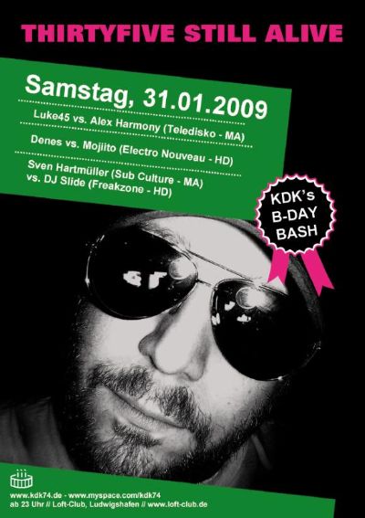 1974, ein Jahr voller einschneidender Ereignisse: Deutschland wird zum zweiten Mal Fußball-Weltmeister, Herr W.A. Mozart feiert seinen 218. Geburtstag, Muhammed Ali kämpft gegen Goerge Foreman und ein Heidelberger Bub erblickt am 27.01. das Licht der Welt: The one and only, Klaus Dieter! Dieses 35-jährige Jubiläum muss natürlich gebührend gefeiert werden und da Dienstags-feiern doof ist, feiern wir gebührend am Samstag, den 31.01.09, mit Geburtstagskind KDK, jeder Menge DJs und mit bester Partylaune im Loft Club (Lageplatzweg - Ludwigshafen - www.loft-club.de). KDK. Was ist alles über diesen jungen Mann zu sagen? Und vor allem, wo fängt man da an? Als langjähriger Mitarbeiter des Szenemagazins Sub Culture RNS unterstützt er tatkräftig in Wort und Bild seine lieben Kollegen, als dauerfotoknipsender Partygast der hiesigen Clubszene beschert er uns immer wieder die verrücktesten Feier-bilder, als Gesprächspartner und Feierkumpane macht er auch aus dem langweiligsten Abend ein Abenteuer. Darum feiern wir mit ihm seinen 35. Geburtstag im Ludwigshafener Loft Club. Selbst noch nie hinter den Turntables gestanden, möchte er auch nicht in dieser Nacht damit beginnen, sodass er für dieses Event sechs jahrelange musikalische Wegbegleiter ins Loft geladen hat. Drei DJ-Combos treffen an diesem Abend aufeinander, die jedem in dieser Region ein Begriff sein müssten. Luke 45 und Alex Harmony die Teledisko-Jungs, die jahrelang den Mannheimer Soho-Club zum Beben gebracht haben und weitere unzählige Events mit heißen Tunes verwöhnt haben. Denes und Mojiito, die Initiatoren von Electro Nouveau, der erfolg-reichsten Eventreihe der Neuzeit in Heidelberg. Beide Herren ver-stehen für die absoluten Verfechter des Elektro-Clash-Sounds und werden sicherlich auch in dieser Nacht für trashige elektronische Klänge im Loft Club sorgen. Zu guter letzt stehen mit Sven Hartmüller und DJ Slide zwei weitere Garanten für perfekten Sound hinter den drehenden Scheiben. Sven Hartmüller, Zimmer-Resident und Chefredakteur des hiesigen Sub Culture-Magazins trifft auf den Urheber der erfolg-reichen Eventreihe "Freakzone", DJ Slide; was ebenso für eine tobende Tanzfläche sorgen wird. Prost!